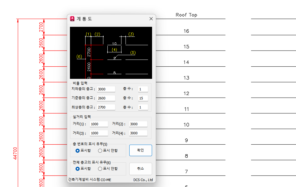 층수, 층고, 치수 기입 여부 등의 조건을 입력하여 신속하게 계통도 기본 틀을 작도한다.