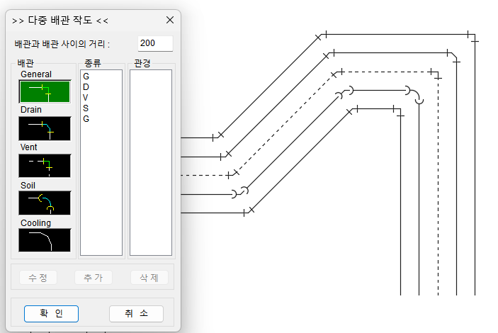 여러 줄의 배관을 작도하려면, 배관 간격과 그리고자 하는 줄 수만큼 조인트 종류를 지정한 후 배관의 경로 위치를 지정하면 여러 줄 배관이 한 번에 작도된다.