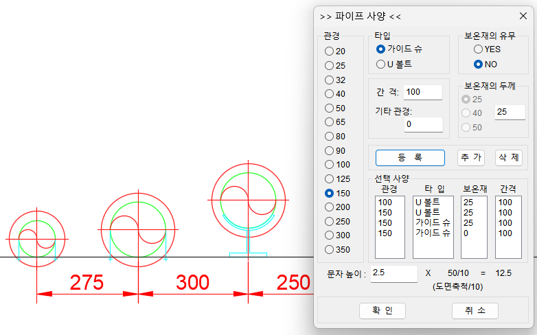 대화상자에서 헤더에 연결되는 배관의 관경과 관 종류를 지정하면 헤더가 작도된다. CAD 도면이지만 CAD 기능을 사용하지 않고 작도한다. 냉온수 공급, 냉온수 환수, 스팀 헤더를 작도한다. 배관 사이 간격을 엑셀 파일 조작으로 조정할 수 있다.