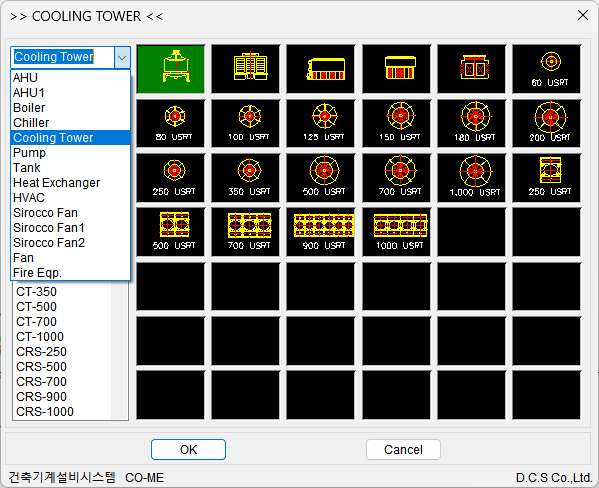 기계설비 작업에 필요한 장비 심볼을 제공한다. AHU, 보일러, 칠러, 냉각탑, 펌프, 탱크류, 열교환기, 실리코팬, 팬, 소방 기기 등 다양한 심볼을 제공하며 쉽게 삽입하여 배치할 수 있는 기능을 제공한다.