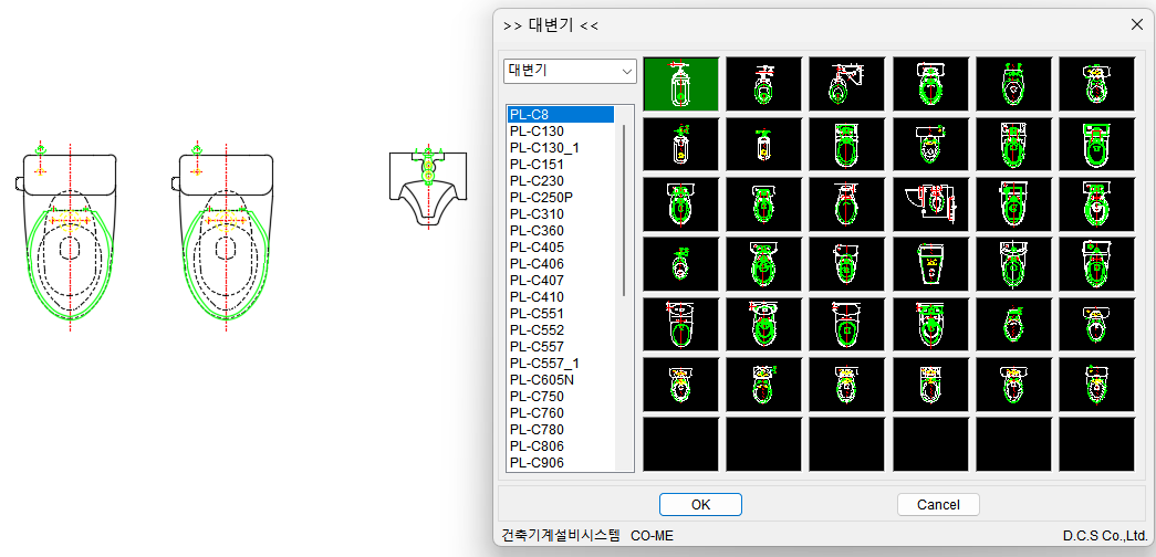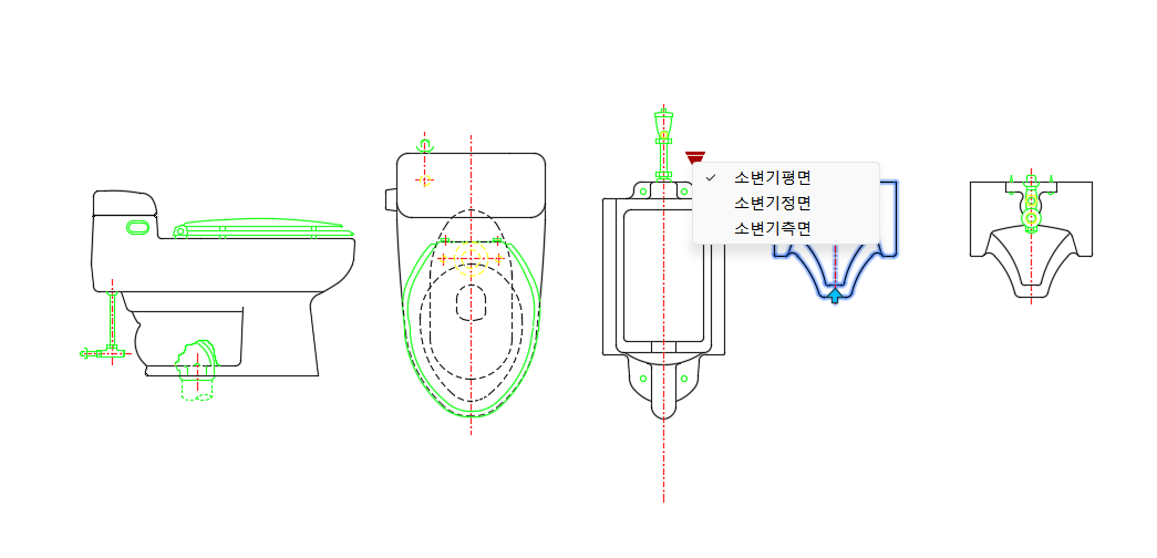 위생기기 심볼을 제공하며 손쉽게 배치할 수 있다. 위생기기 심볼은 다이나믹 블록으로 베치후 평면도, 정면도, 측면도를 선택할 수 있다.