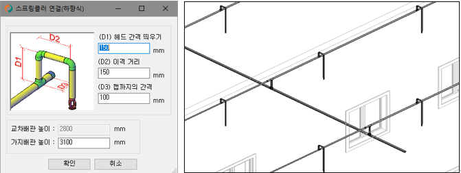 | 소방배관 하향식, 플렉시블(자동/수동) 모델링 | 하향식 소방배관을 수동 및 자동으로 모델링한다. 지정 조건에 따라 플렉시블로 헤드에 연결한다. |