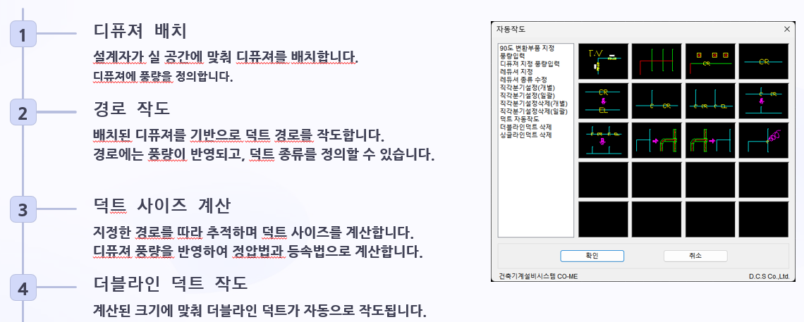 덕트 설계 작업의 일련의 프로세스를 따라 실행한다. 디퓨져 배치, 메인 경로 작도, 가지 경로 작도, 덕트 사이즈 계산 및 편집, 더블라인 작도의 순서로 진행된다.