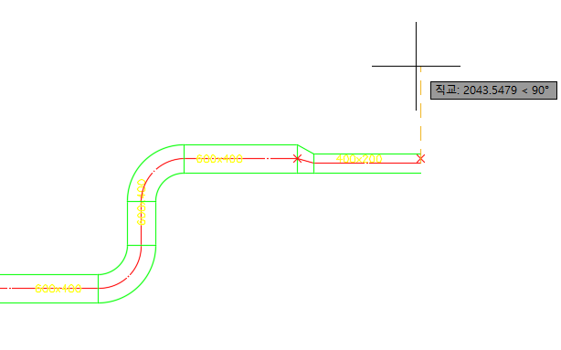 또 다른 방법은 경로를 미리 그리지 않고, 덕트 사이즈를 입력한 후 작도하고자 하는 위치를 지정하면 더블라인으로 그려진다.